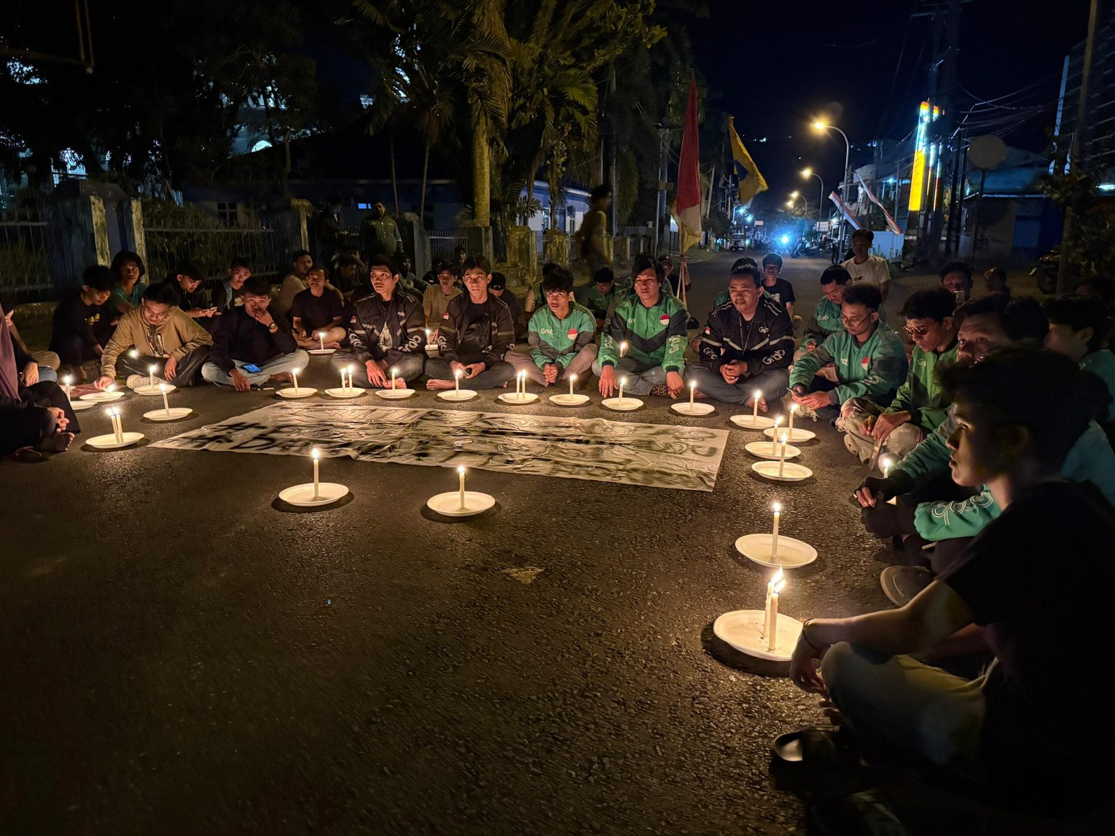 Aksi digelar di depan Kantor DPRD Kabupaten Mamuju, Jalan AP Pettarani, Jumat (29/8/2025) malam. Dengan menyalakan puluhan lilin dan menggelar doa bersama, massa menyampaikan rasa duka sekaligus kekecewaan mendalam atas insiden tersebut.